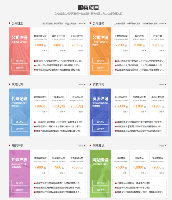 创业必选:梳理不同细分领域服务项目,为客户提供省时省心整合服务包。