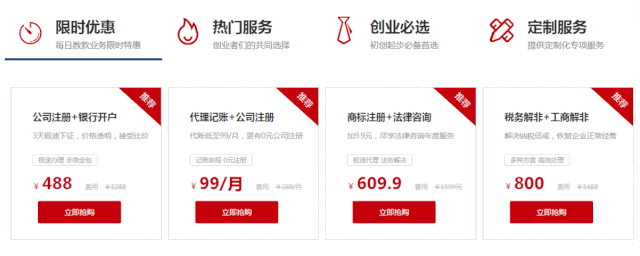 限时优惠:数款核心业务限时特惠,业务项目定时更换,满足企业全方位服务需求。